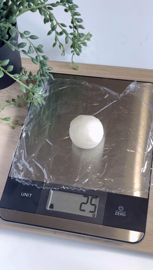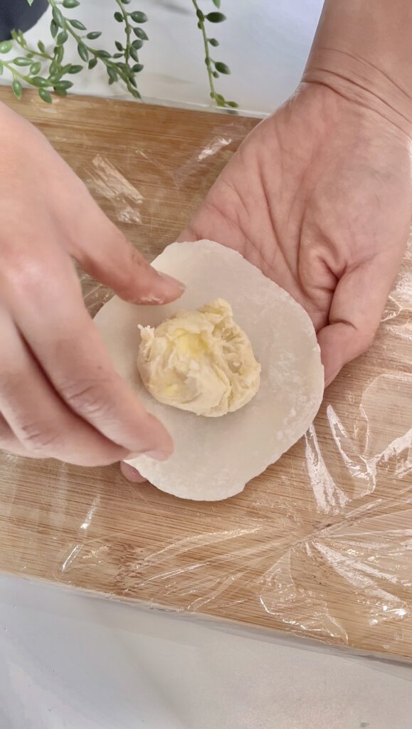 - Take one piece of snow skin (25g) and one durian filling ball (25g).